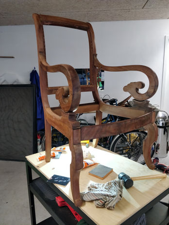 A new life for these four antique family armchairs needed to be re-think to become focal points in a monochromatic modern living room.